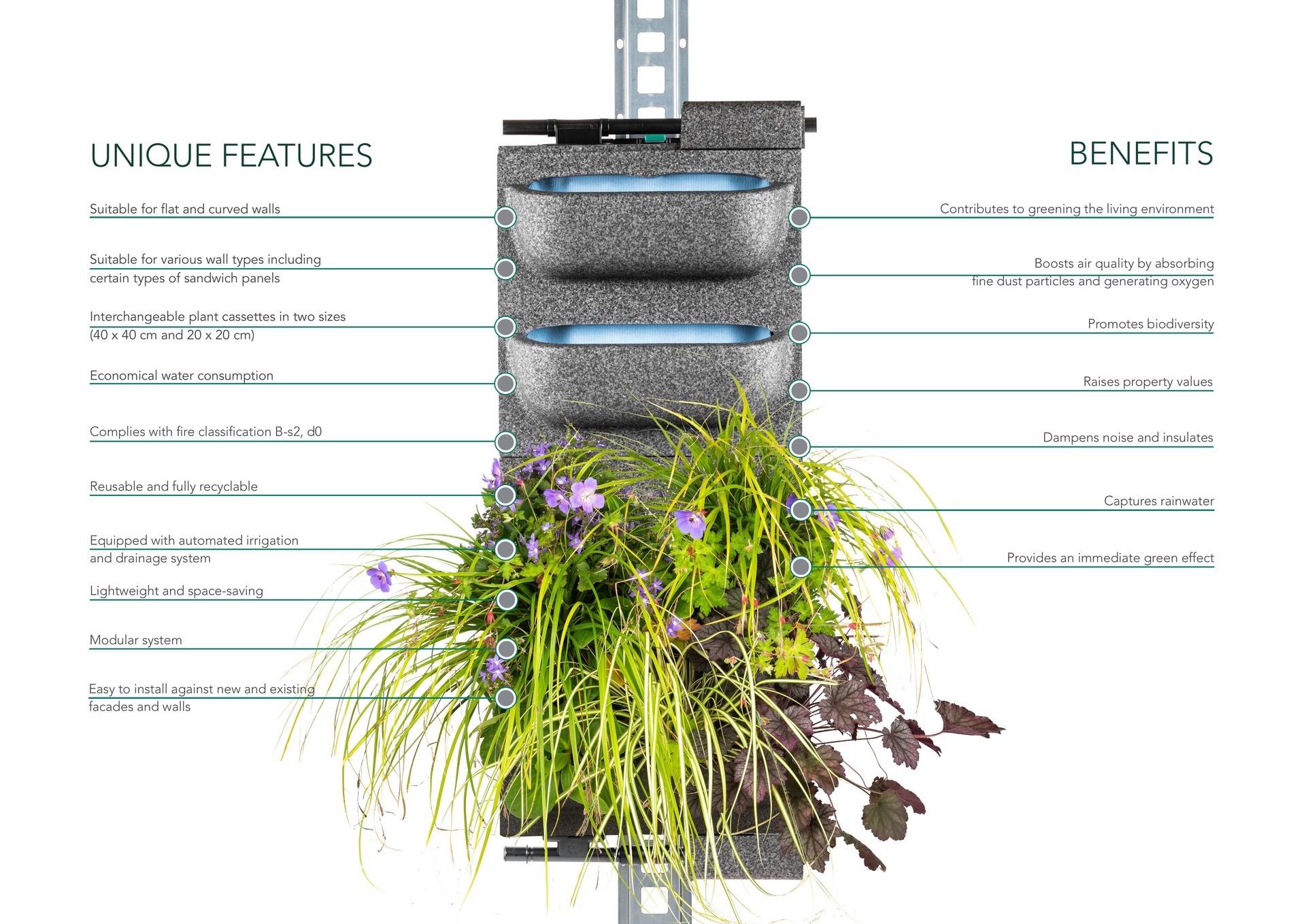 모듈식 시스템은 무한한 활용 가능성을 제공합니다. 내식성 프로파일은 뒷벽의 형태와 배치에 따라 수평 또는 수직으로 설치할 수 있습니다. 이 프로파일은 40 x 40 cm 크기의 플랜트 카세트와 20 x 20 cm 크기의 쿼터 카세트(픽셀)를 지지하는 구조를 제공합니다.